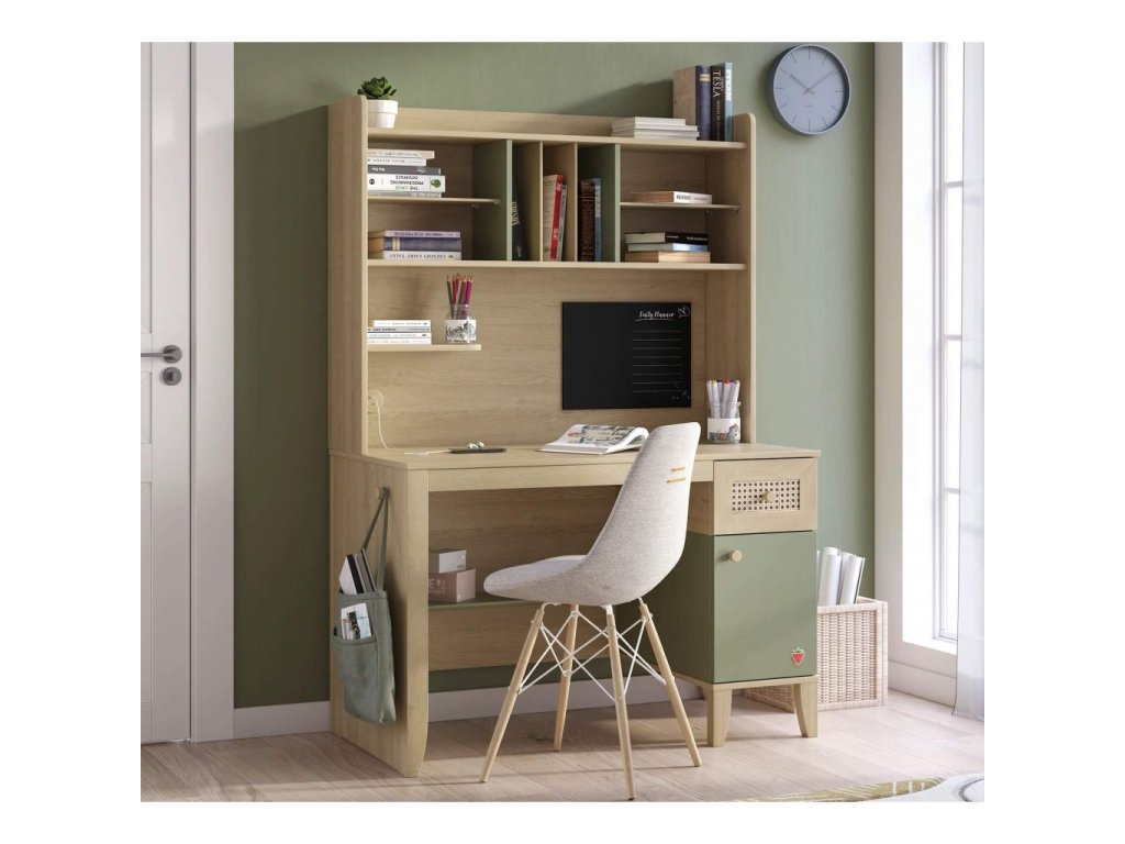 Písací stôl je v dnešnej dobe súčasne aj pracovným miestom na prácu s počítačom. Veľké stolné počítače sú však na ústupe a nahradili ich notebooky, takže nezaberajú veľa miesta – nie je teda nutné plochu stola nejako extra zväčšovať. Na pravej strane stola praktická skrinka so šuplíkom. Odporúčame stôl doplniť o jeden z dvoch ponúkaných nástavcov na stôl.