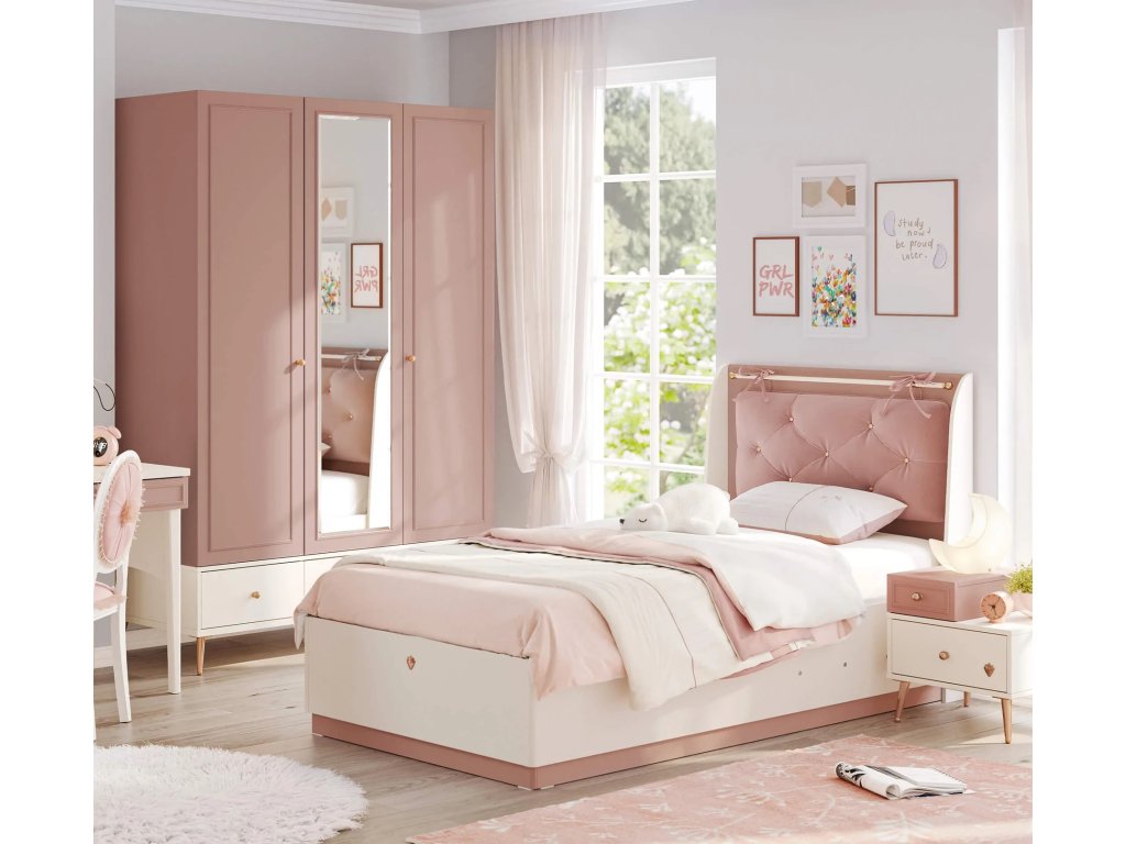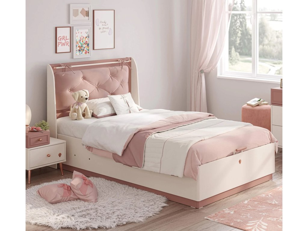Farebné prevedenie - kombinácia krémovej a staroružovej farby. Konštrukciou je posteľ koncipovaná pre dospelého človeka, nosnosť lôžka je 130 kg. Matrac odporúčame s pružinovým jadrom, priamo od výrobca navrhnuté matrace nájdete v sekcii Doplnky - matrace. Pridanou hodnotou tejto postele je objemný úložný priestor pod celou ložnou plochou. Prístupný je vyklopením doskového roštu pomocou madla umiestneného z čela pri nohách postele. Vďaka aretácii po vyklopení drží v otvorenej polohe. Dno úložného priestoru je odvetrávané. Využitie je vďaka veľkosti takmer nepreberné. Na ukladanie športových potrieb, sezónneho oblečenia, hračiek, atď.