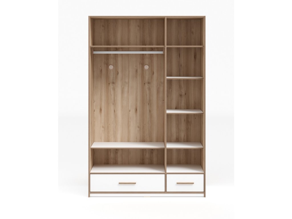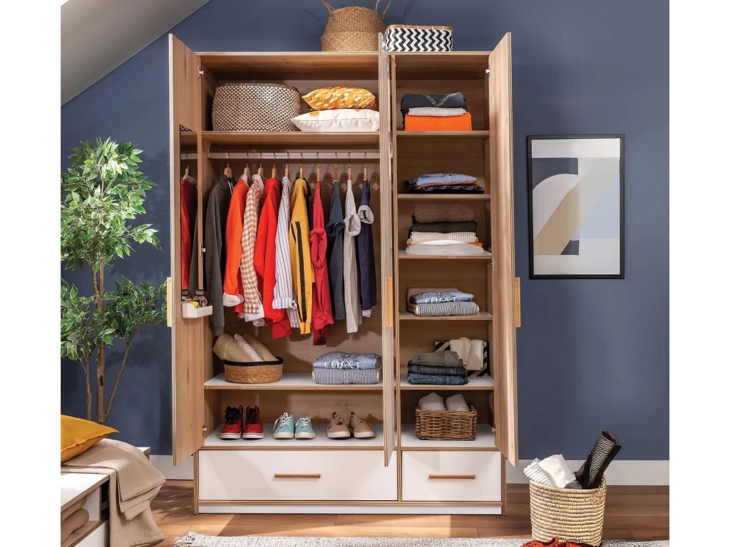 Vďaka členenie na policovú časť nebude problém udržiavať v skrini prehľad a poriadok. Police využijete napríklad na tričká a svetre. Pneumatické brzdy dverových pántov zaistí tiché a predovšetkým bezpečné zatváranie dverí.