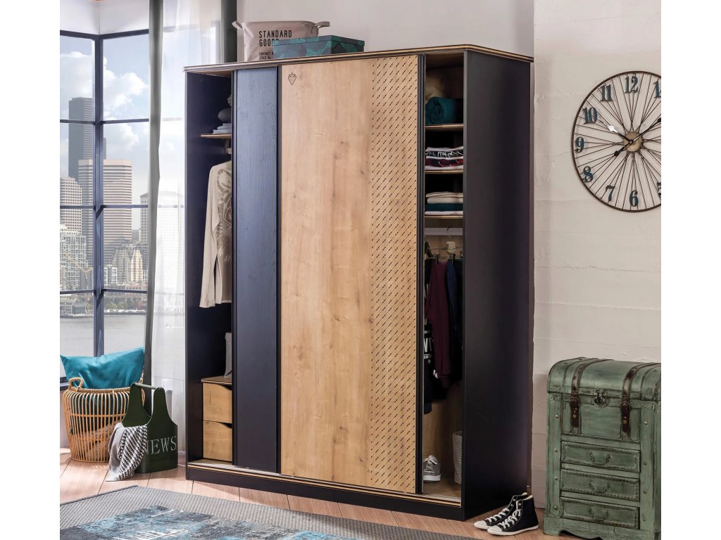 Moderná izba pre teenagera či študenta v tmavých farbách, to je kolekcia nábytku Black. V ponuke sú dva typy študentských skriňa s rozdielnou šírkou. Šatníková skriňa s posuvnými dverami, je veľmi priestorná a praktická. Šatníková skriňa trojdverová má veľké priestorné police, šatníkovou tyč a z vonkajšej strany zrkadlo. V pravom krídle šatníkovej skrině nájdete zaujímavé prevedenie s otvorenou spodnou časťou skrine. Záda obidvoch skriní sú vybavené ventilačnými otvormi, ktoré zabezpečujú vzdušnosť vnútorného priestoru skrině. Je teda možnosť si vybrať tú, ktorá najviac vyhovuje vašim potrebám a dispozíciám detskej alebo študentskej izby.