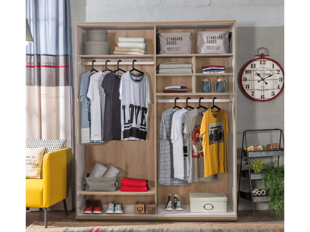 Skriňa s posuvnými dverami Duo ponúka dostatok úložného priestoru - 2x šatníková tyč a niekoľko políc.